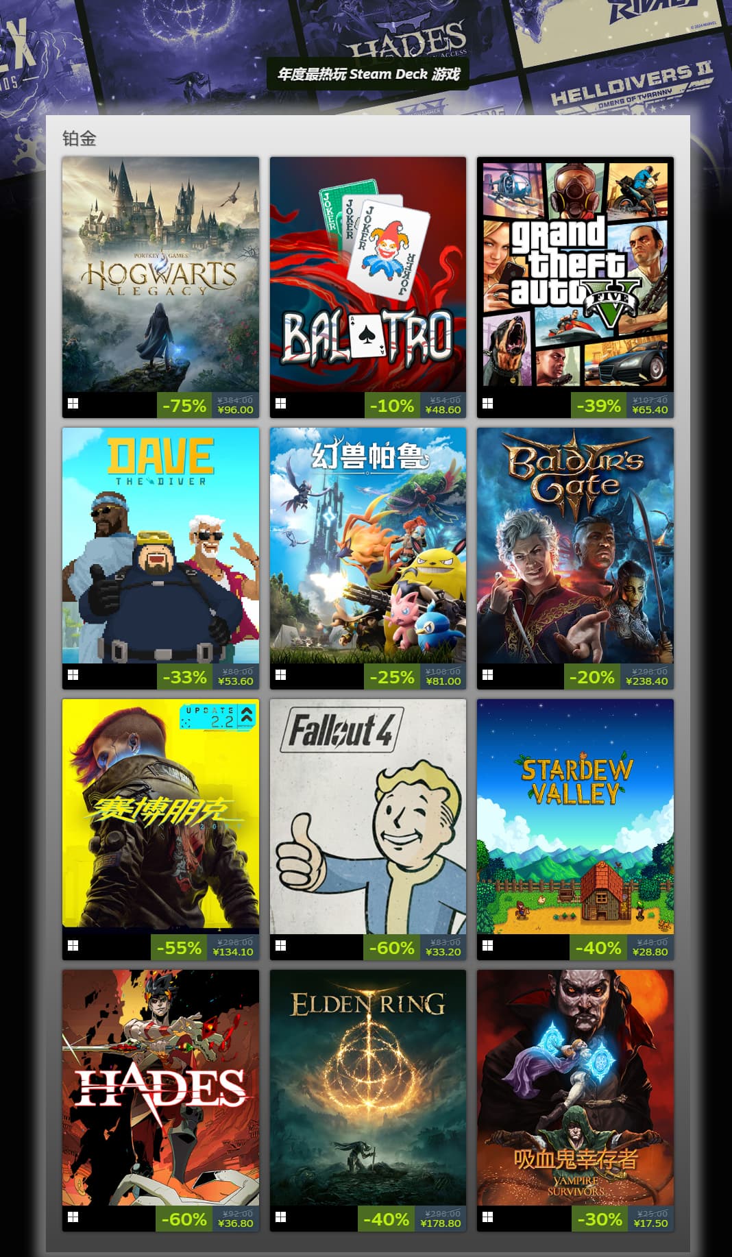 Steam Deck用户游玩最多的游戏:《霍格沃兹之遗》《小丑牌》《那个游戏5》《潜水员戴夫》《幻兽帕鲁》《博德之门3》《赛博朋克2077》《辐射4》《星露谷物语》《黑帝斯》《艾尔登法环》《吸血鬼幸存者》。