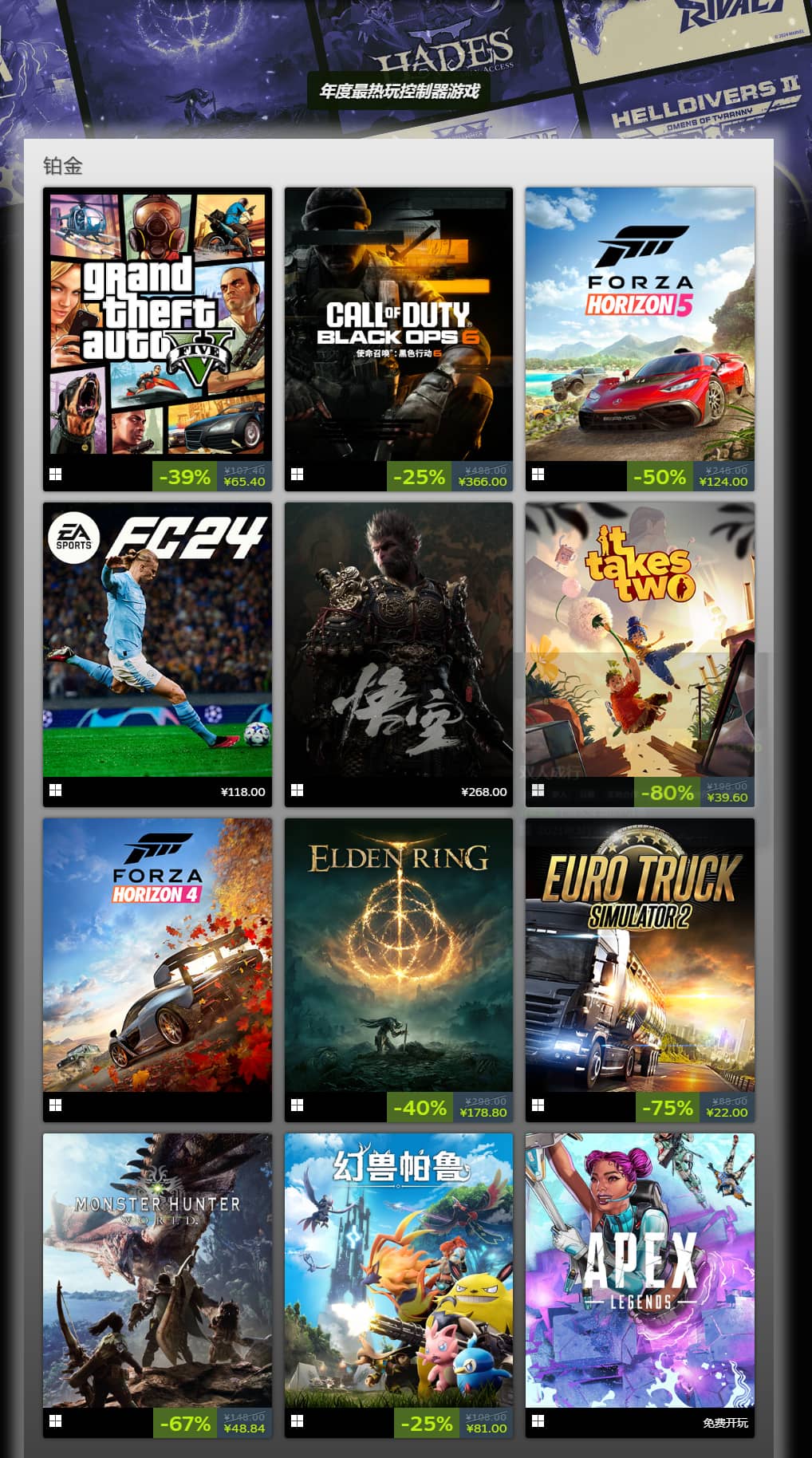 使用控制器游玩最多的游戏:《那个游戏5》《COD:黑色行动6》《极限竞速:地平线4&5》《EA SPORTS FC 24》《黑神话:悟空》《双人成行》《艾尔登法环》《欧洲卡车模拟2》《怪物猎人:世界》《幻兽帕鲁》。