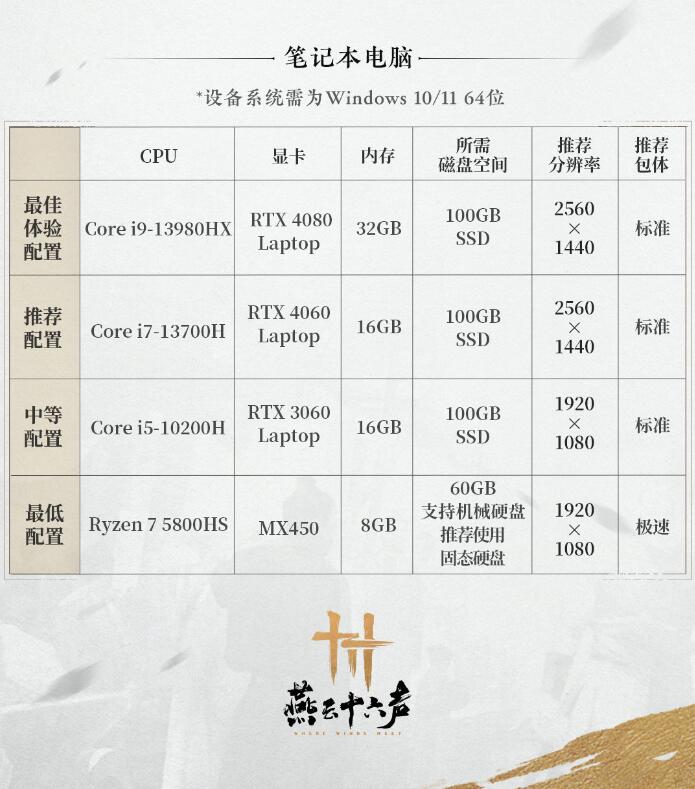 【预下载开启!《燕云十六声》公测剧情预告片公布】《燕云十六声》PC客户端预下载现已正式开启,官方今日公布了一段游戏的剧情预告片。《燕云十六声》PC公测即将于2024年12月27日10:00开服。根据官方发布的配置要求所示,玩家需要为游戏标准包体预留空间100G、极速包体60G(硬盘推荐SSD,详情参考附图)。 *点击首图查看视频*