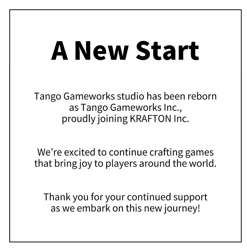 【Tango Gameworks宣告重生】Tango Gameworks工作室今日发表了公司成立公告。文中写道:“现在起,我们将作为KRAFTON集团的一员,再次以Tango Gameworks之名开启新的旅程。”Tango Gameworks曾打造过《恶灵附身》《幽灵线:东京》《完美音浪》等作,去年微软将其解散后被KRAFTON接收。今日的公告也意味着Tango Gameworks正式迎来了重生。