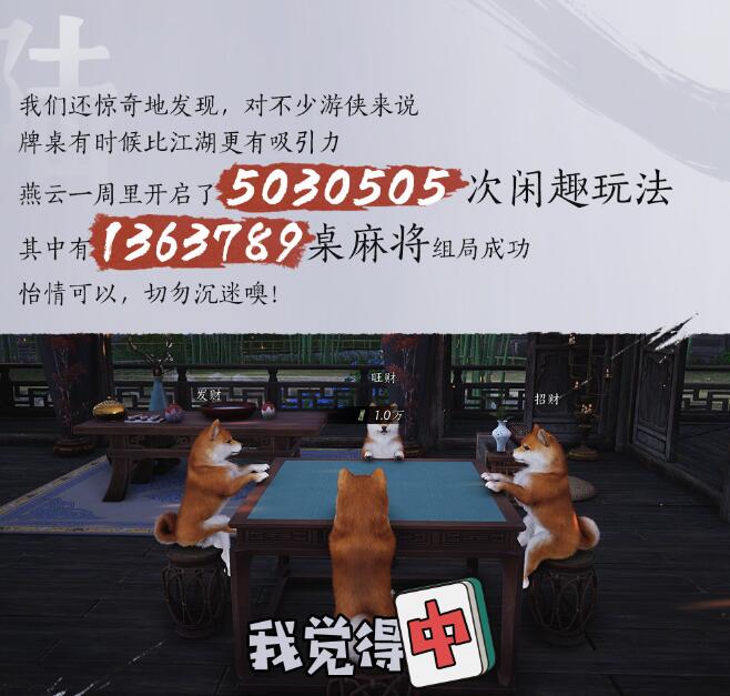 6、一周里开启了5030505次闲趣玩法,其中有1363789桌麻将组局成功。