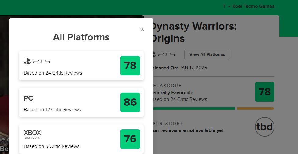 【《真三国无双:起源》MC媒体均分78,获IGN 9分评价】光荣特库摩新作《真三国无双:起源》全球媒体评测现已解禁。目前游戏在MC上PS5版均分78(暂由24家媒体给出),PC版86分(暂由12家媒体给出),Xbox版76分(暂由6家媒体给出)。其中IGN、Noisy Pixel等媒体给出9分,Game Rant、Push Square、GamesRadar+、Windows Central、PCGamesN等媒体8分,VGC则给出3星(6分)的评价。