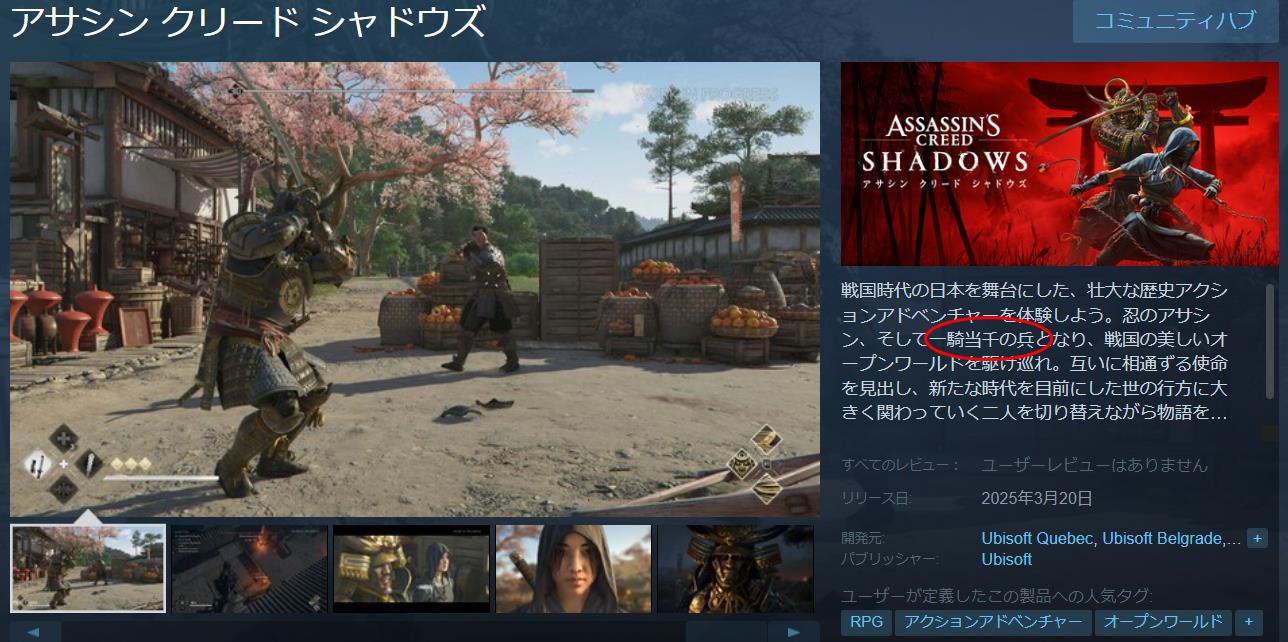 【《刺客信条:影》Steam日文页面中“武士”一词已被删除】自《刺客信条:影》公布以来,在黑人主角弥助“武士”身份的问题上就争议不断。目前日本地区Steam商店页面中的“武士(侍)”一词已被完全删除,并使用了“一骑当千之兵”进行了替换。现阶段Steam上的中文及英文页面描述还未被改动,PSN日本商店上的信息可能尚未来得及更新(仍显示的原发售日),故目前仍能看到原来的内容(详见附图)。《刺客信条:影》是《刺客信条》系列最新作,此次的舞台来到了战国时期的日本,并采用了弥助和奈绪江双主角设计。游戏现已延期至3月20日发售。