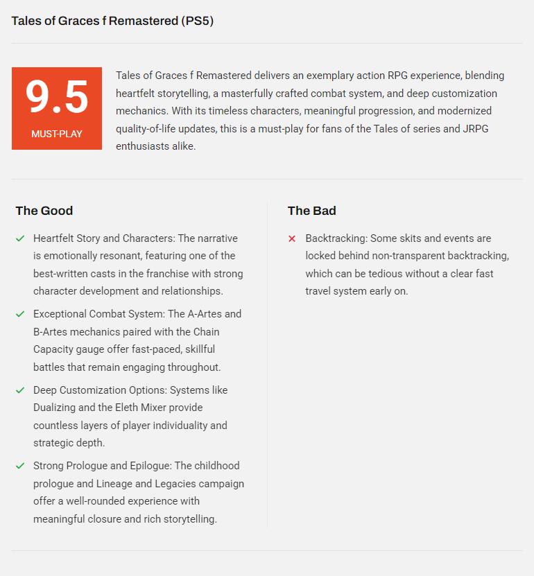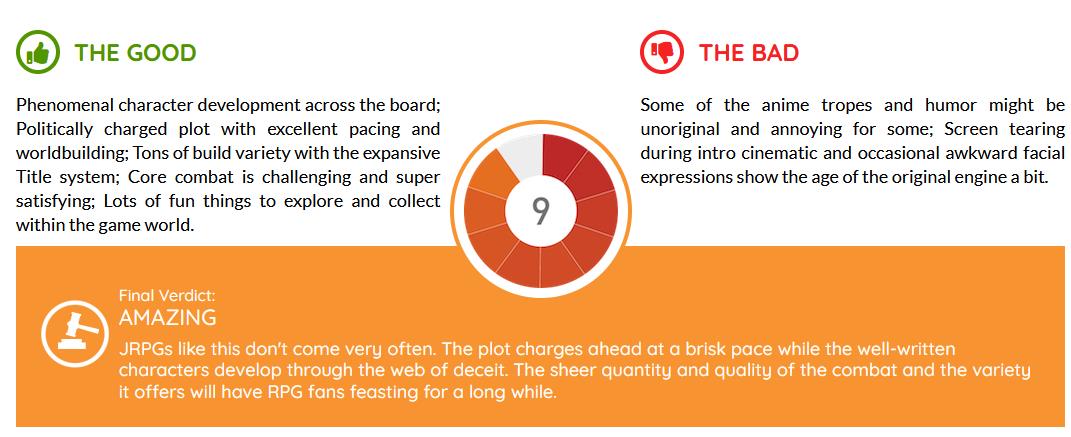 GamingBolt(9分):如此优秀的JRPG并不常见,剧情的推进节奏、世界观构建、优秀的战斗系统以及令人满足的探索和收集内容会让RPG粉丝沉迷其中无法自拔。