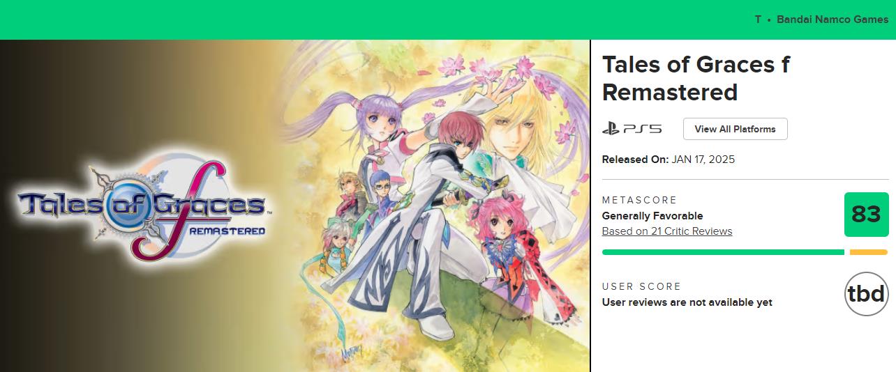 【《圣恩传说F:复刻版》MC媒体均分83分】由万代南梦宫所带来的经典RPG《圣恩传说F:复刻版》全球媒体评测现已解禁。本作目前在MC上PS5版均分83(暂由21家媒体给出)、PC版82(暂由7家媒体给出),OpenCritic上均分也为83(暂收录33家媒体)。部分媒体的简评如下(满分为10分/5星):