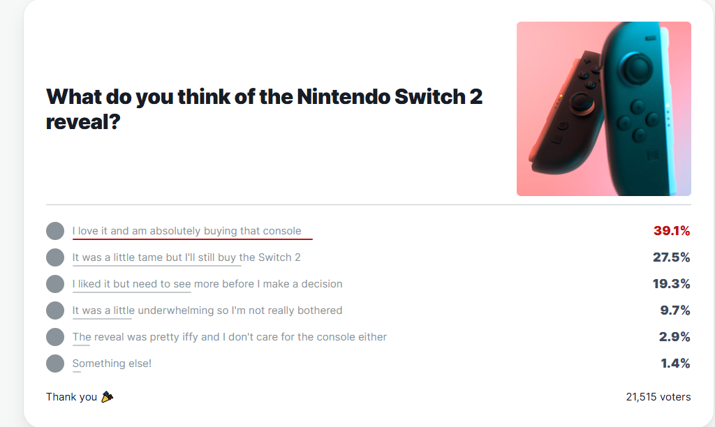 此外,在IGN发起一项“你如何看待Switch 2”的投票中,接近7成玩家选择购买Switch 2。