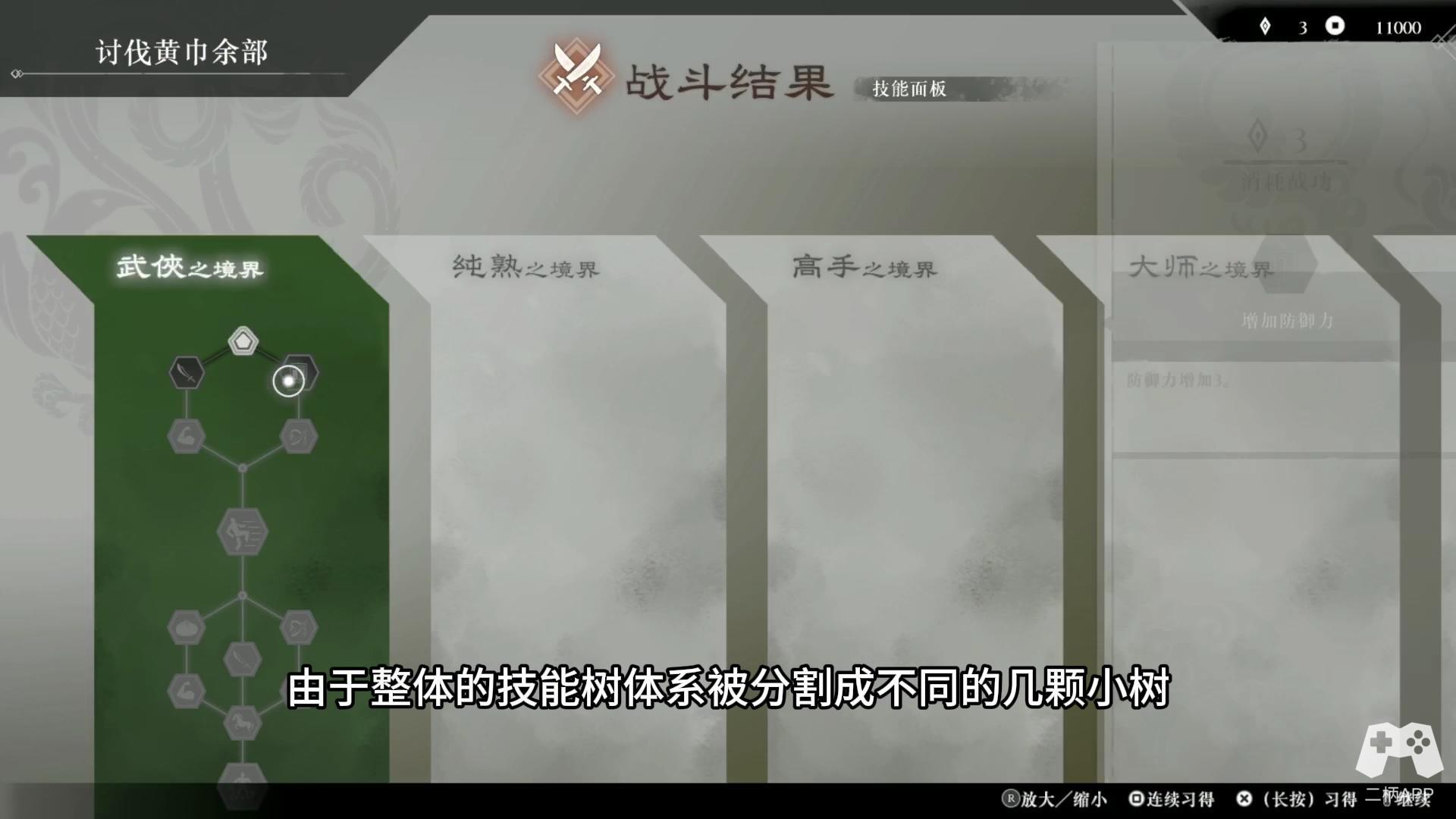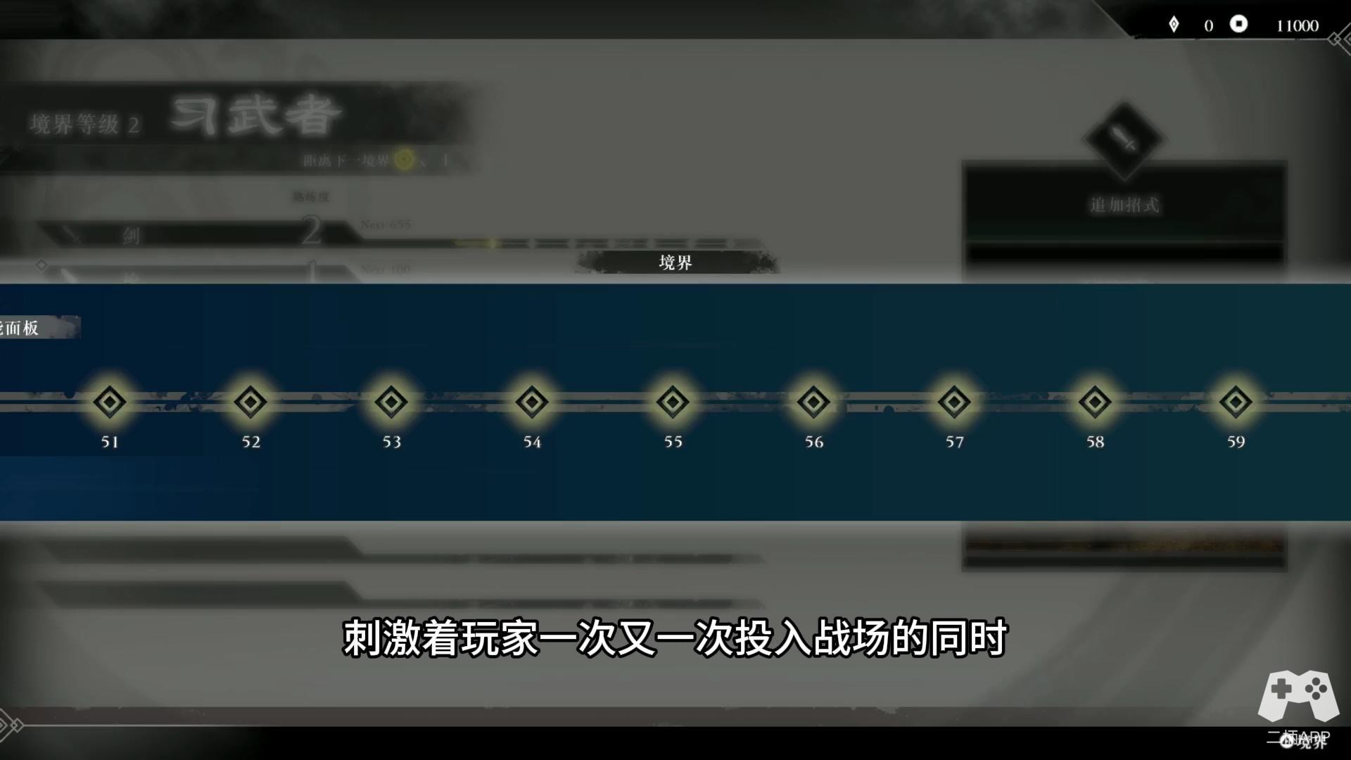 玩家武器熟练度等级的提升会引发名为境界的个人等级系统提高,在境界等级提高后便能够消耗从战斗中获得的战功奖励来解锁不同技能,进一步深化角色的强度。