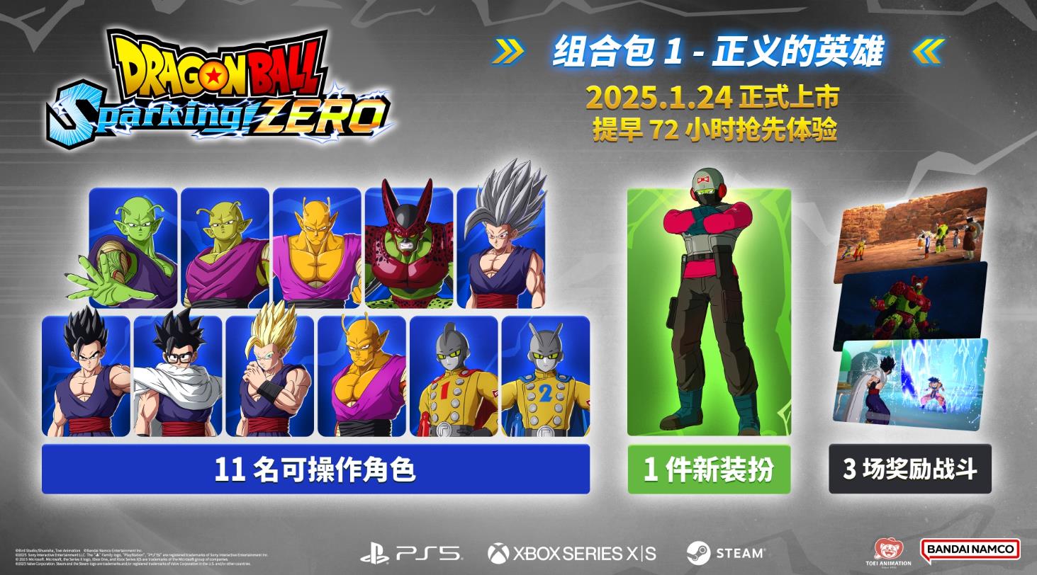 此外,DLC1”正义的英雄”组合包也即将在1月24日上线。其中带来了孙悟饭(SH)、孙悟饭(SH)超级赛亚人、究极悟饭(SH)、孙悟饭野兽、比克(SH)、比克(SH)潜在能力释放、橙色比克、橙色比克 巨大化、伽马1号 、伽马2号、极限沙鲁等11名可操作角色,以及1件新装扮和3场特级战斗。购买季票的玩家,可享有72小时抢先体验权。