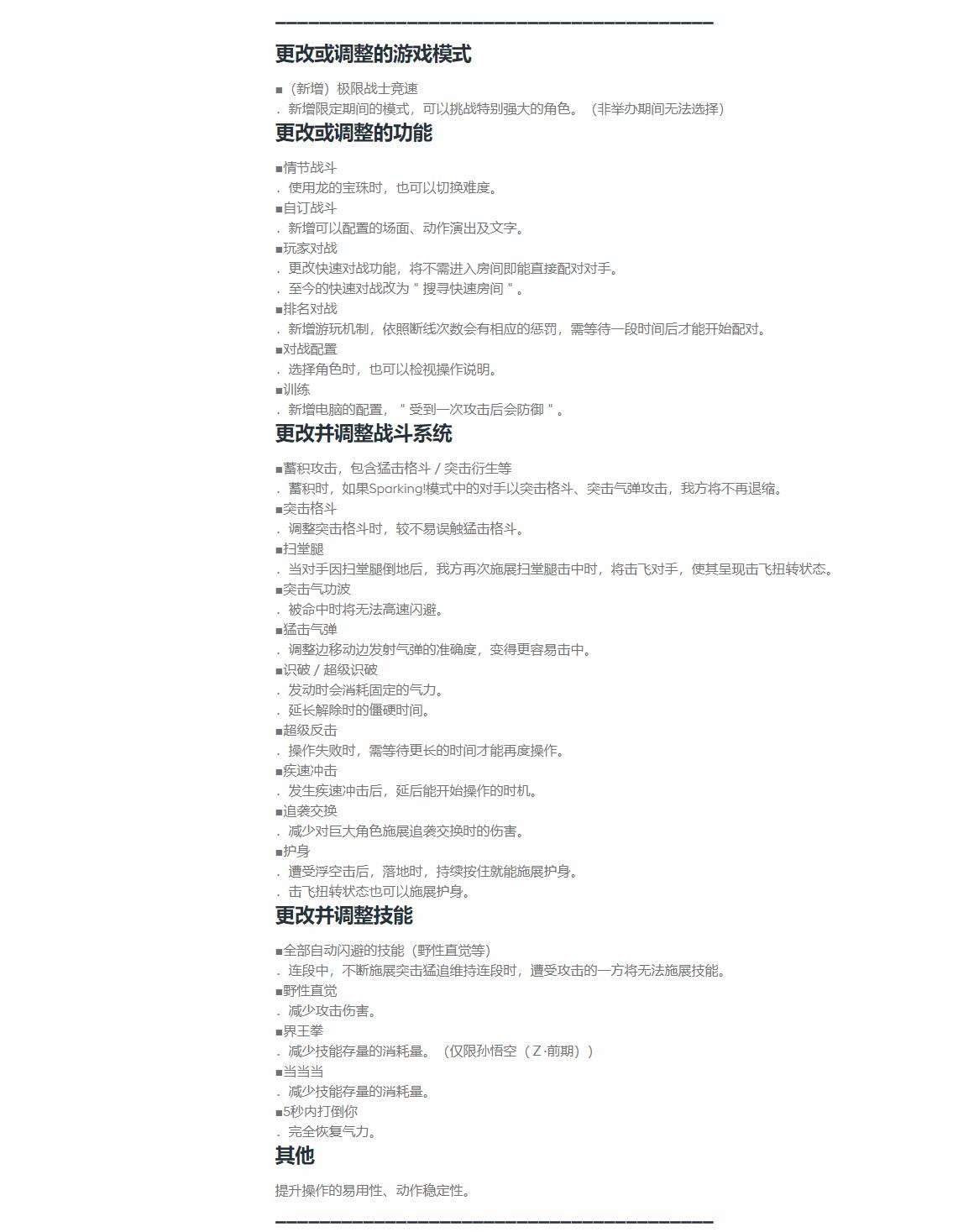 【《七龙珠:电光炸裂Zero》更新上线:新增极限战士竞速模式】《七龙珠:电光炸裂Zero》最新更新现已上线。其中新增了期间限定模式“极限战士竞速”,并带来了各模式功能上的调整以及战斗系统和技能的优化等内容(具体说明可参考图5)。