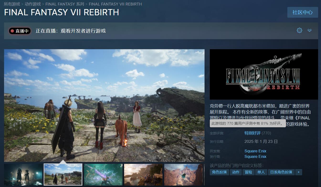 《最终幻想7:重生》Steam上获玩家”特别好评“