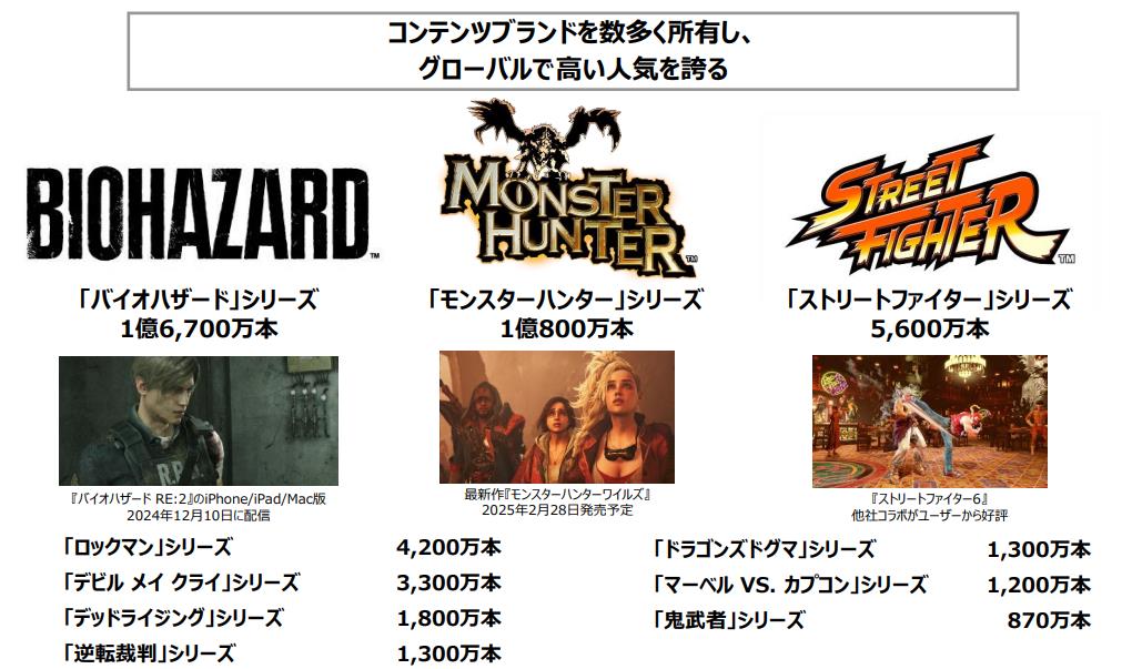 【Capcom最新财报公布:《生化2重制》销量超过1500万】Capcom今日公布了2024年4~12月的财报。根据数据显示,公司在此期间营业额为888.53亿日元(同比减16.3%),最终利益130.66亿日元(同比减33.4%)。减少的原因主要是缺乏新款大作的推出,且《街霸6》等之前作品的收益放缓所致。以下为财报中所更新的部分游戏销量(截至去年12月末):