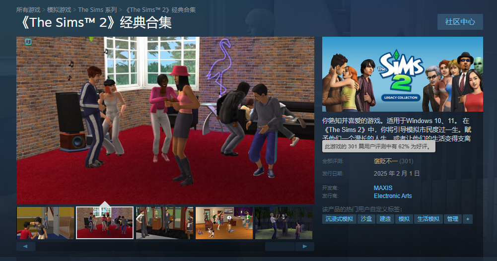 【庆祝25周年!《模拟人生1&2》经典合集上线,携全DLC登陆PC】为庆祝《模拟人生》系列诞生25周年,EA今日正式推出《模拟人生:经典合集》与《模拟人生2:经典合集》,首次实现两款经典作品的数字版发行。游戏现已登陆PC端EA App、Epic及Steam平台,定价分别为118元和158元,捆绑购买可享198元优惠价。