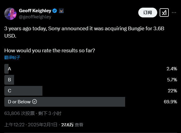 【投票显示大部分玩家对索尼36亿美元收购Bungie表示失望】自从索尼以36亿美元收购Bungie已过去三年。近日,TGA创办人Geoff Keighley发起的一项针对该收购的调查,根据结果显示,近70%的玩家对该交易表示很失望。该投票目前超过60,000名玩家参与。