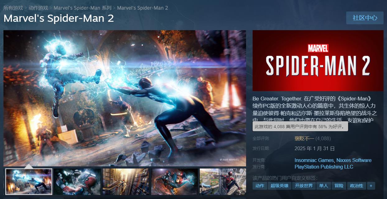 【《漫威蜘蛛侠2》成为Steam上PS第一方游戏评价最差游戏】《漫威蜘蛛侠2》PC版发布后,因各种闪退、崩溃等情况的出现,玩家给游戏打出了差评。目前本作已成为Steam平台上PlayStation第一方作品中口碑最低的游戏之一。游戏现在好评率仅有58%,与《蜘蛛侠:高清重制版》的95.88%,《蜘蛛侠:迈尔斯•墨拉莱斯》的93.25%有着很大的差距。