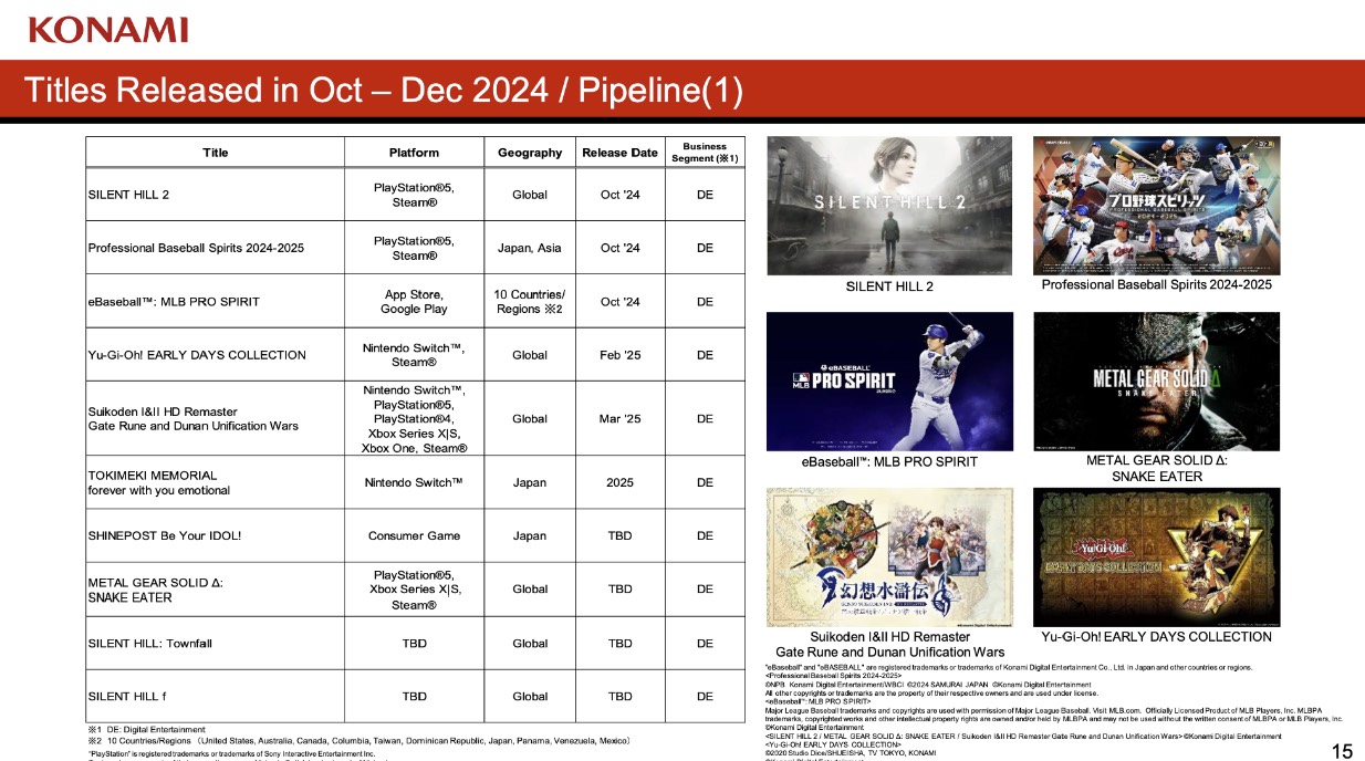 【KONAMI业绩创新高:多款新作蓄势待发】KONAMI公布了2024年4月至12月的财报,其中: 1.公司期间营业额、利润均有着很大的增长,并创下新纪录; 2.《eFootball》下载量超过8亿次; 3.《寂静岭2: 重制版》销量超过200万份; 4.《寂静岭》系列新作《寂静岭: Townfall》《寂静岭f》开发中; 5.《合金装备Δ 食蛇者》《幻想水浒传1&2 HD复刻版》《心跳回忆》等多款作品蓄势待发。