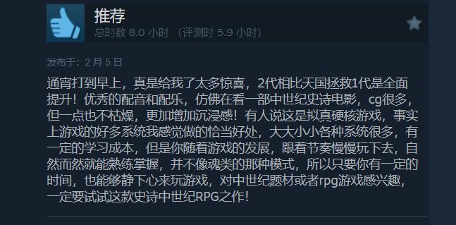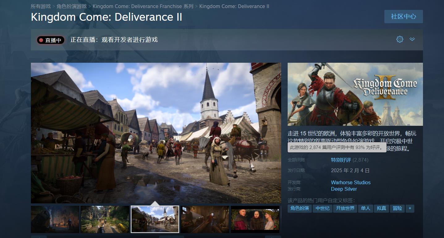 《天国:拯救2》Steam上玩家峰值近16万,获“特别好评”