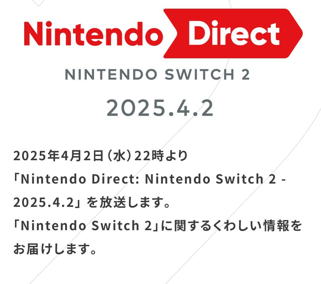 【任天堂公布NS2直面会准确时间】任天堂官方宣布,将在北京时间4月2日晚9点,播放名为“Nintendo Direct: Nintendo Switch 2 - 2025.4.2”的直面会,带来有关Nintendo Switch 2的详细情报。官方此前在公布NS2主机时宣布会在4月2日举行直面会进行介绍,如今终于确定了具体时间。