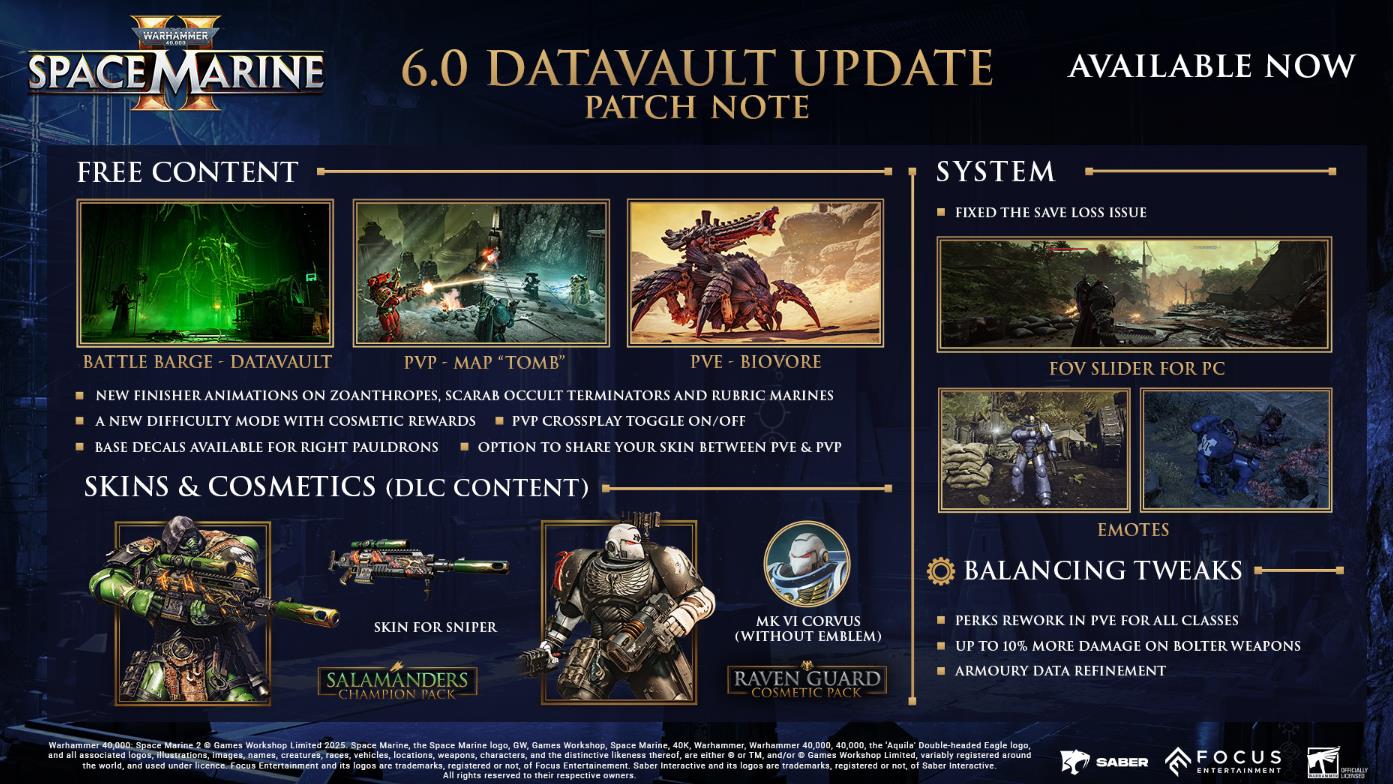 【《战锤40K:星际战士2》6.0"数据宝库"更新现已推出】《战锤40K:星际战士2》6.0"数据宝库"更新现已上线,此次更新为所有玩家带来了更多免费内容以及体验优化,同时让季票持有者能获取更多外观装饰品,用以定制他们的星际战士。主要内容包括: