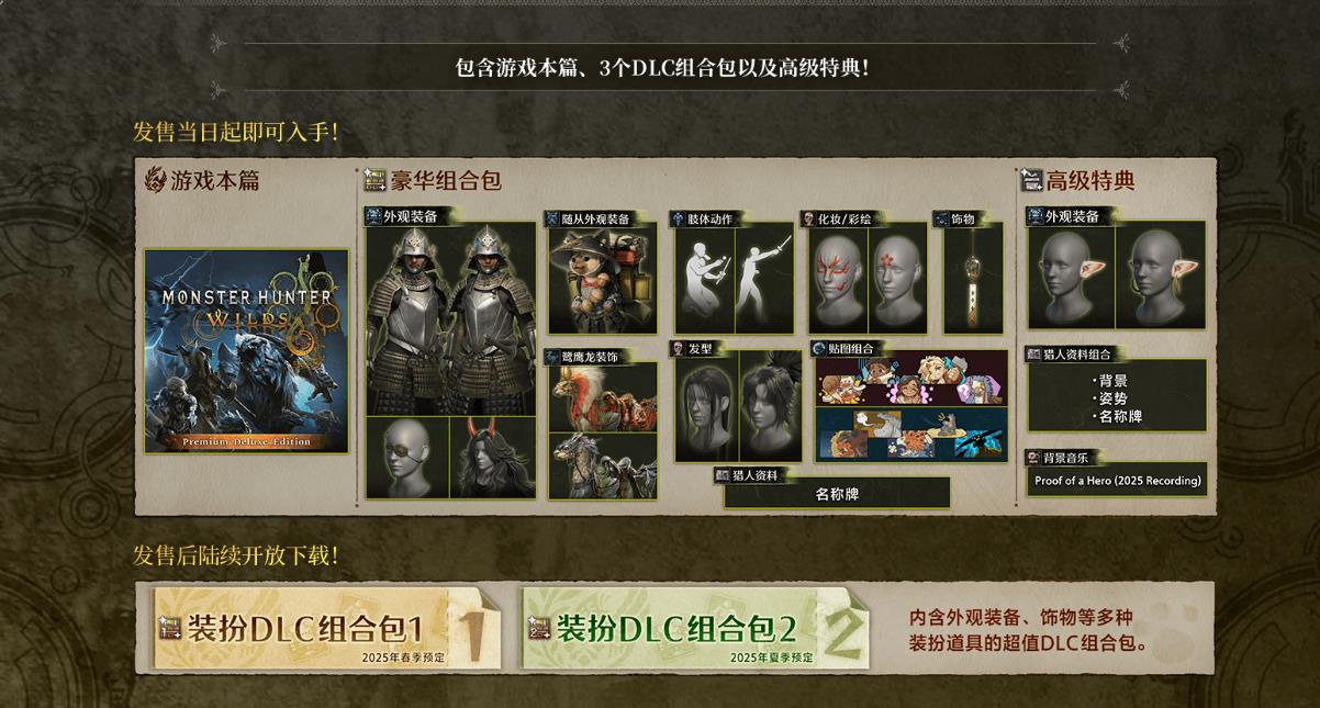 【《怪物猎人:荒野》豪华版内容预览】《怪物猎人:荒野》官方今日放出了游戏豪华版的内容预览。其中包括游戏首日就可使用的外观装备、发型、肢体动作、饰物、贴图组合等内容。高级豪华版则附带高级特典(外观+资料组合+背景音乐“英雄之证2025再录版”)以及分别预计在春季和夏季推出的装扮DLC组合包。