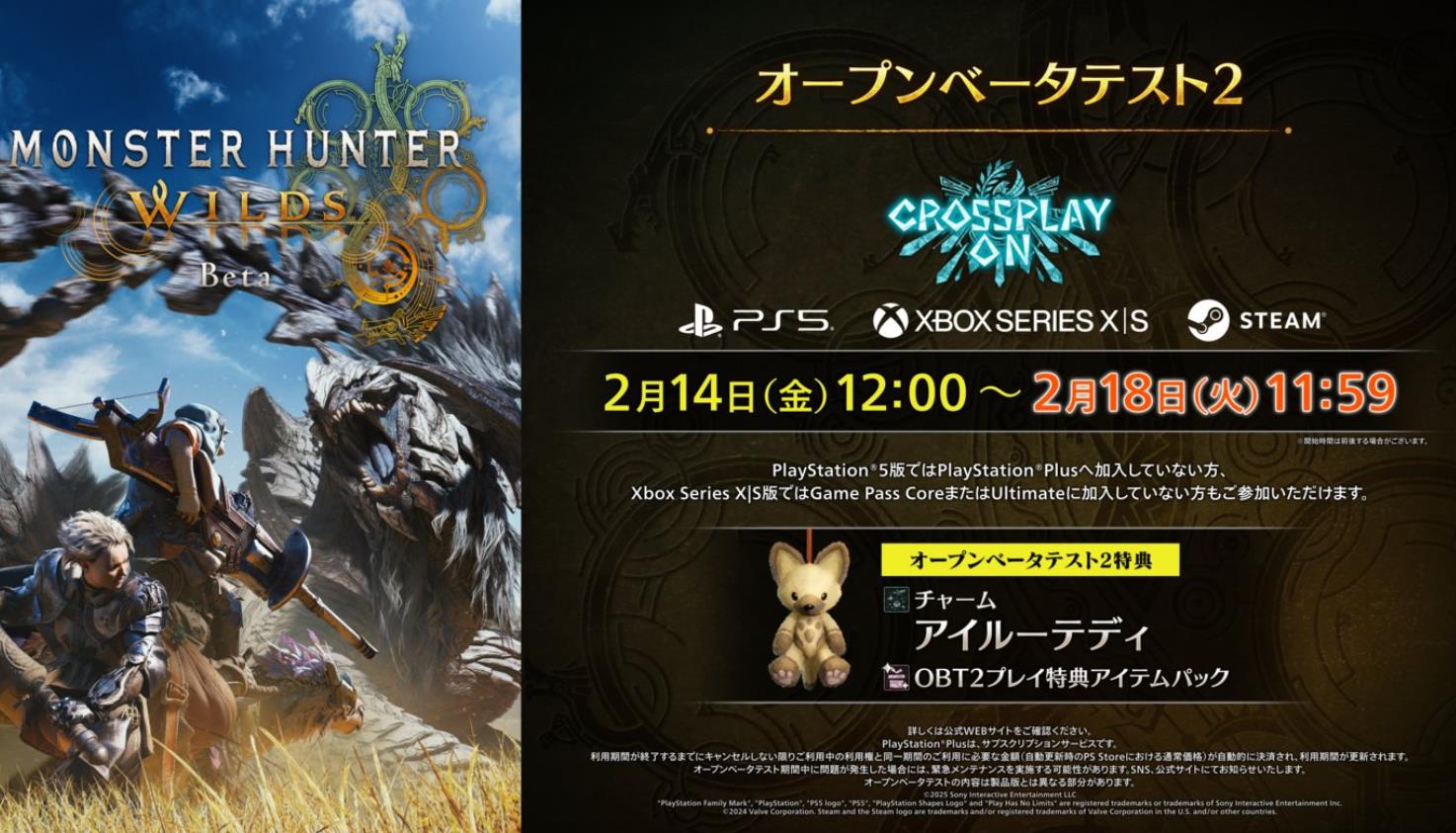 《怪物猎人:荒野》预计在2月14日开启2测第2轮,因此前PSN网络出现故障,官方宣布该轮测试(全平台)多加1天测试时间(即截至2月18日10:59)。游戏正式版将于2月28日发售,登录平台为PS5、Xbox Series、Steam。