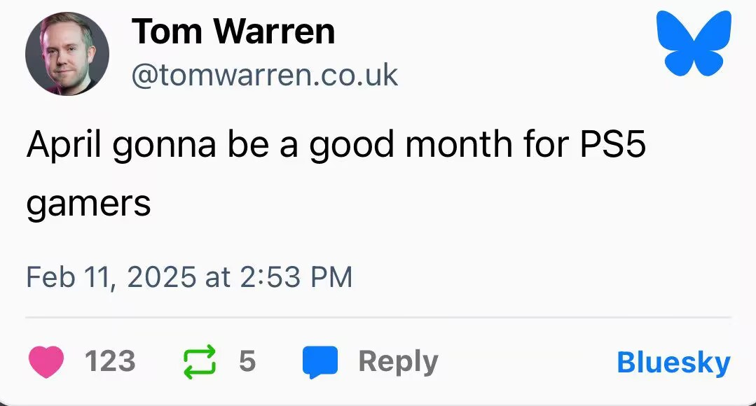 【部分已宣布登录PS5的Xbox游戏或在4月上线】TheVerge主编Tom Warren在个人社媒上发文称:“4月对PS5玩家来说会是个好月份。”Tom Warren主要负责微软和Xbox相关新闻的撰写,他也是最早暗示《极限竞速:地平线5》等作品登陆PS5的媒体人之一。