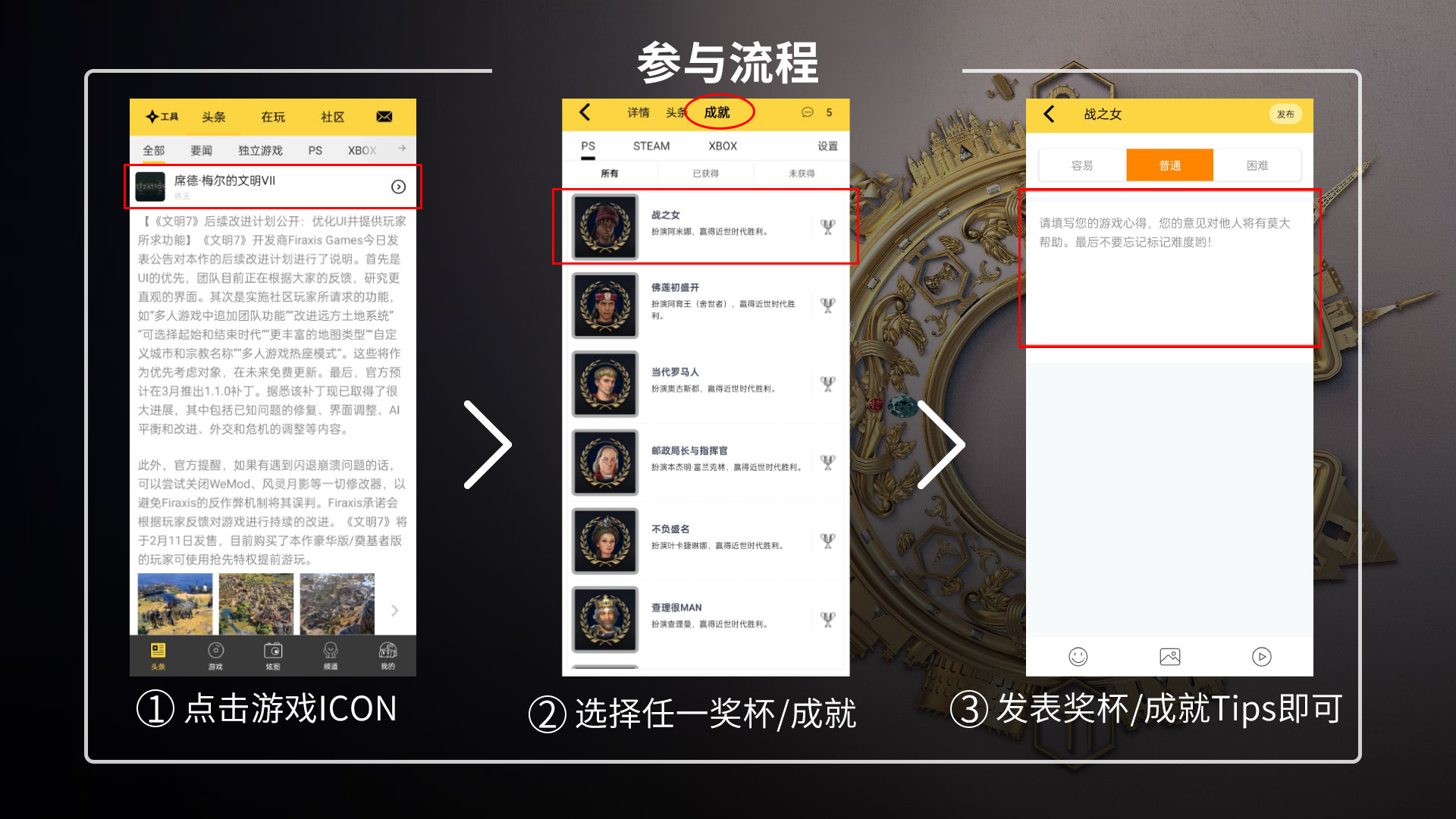 活动要求:在《文明7》PS奖杯/Steam成就/Xbox成就(任选其一)页面,给你已获得的奖杯/成就发表获取心得