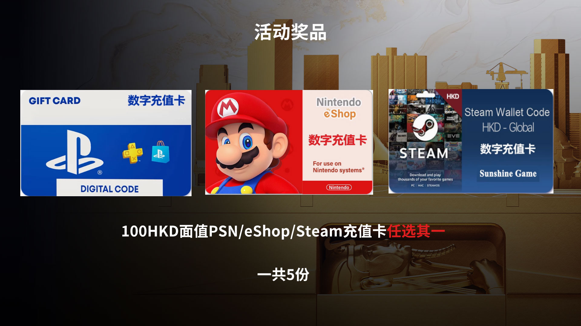 活动奖励:5张100HKD面值PSN/Steam/eShop点卡任选其一