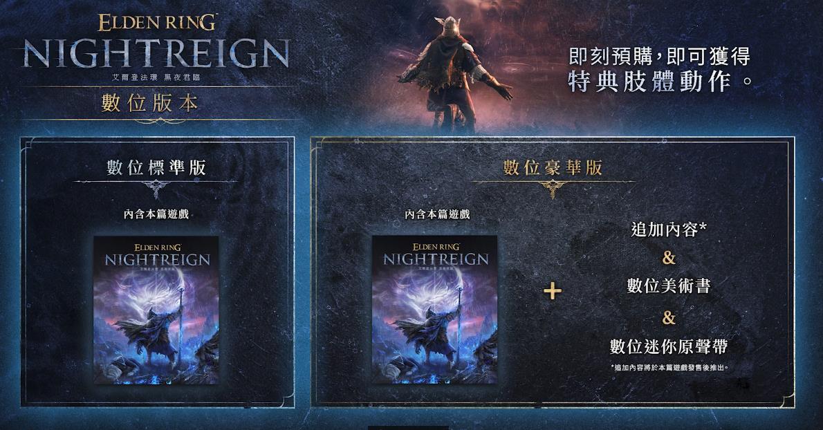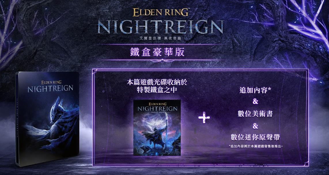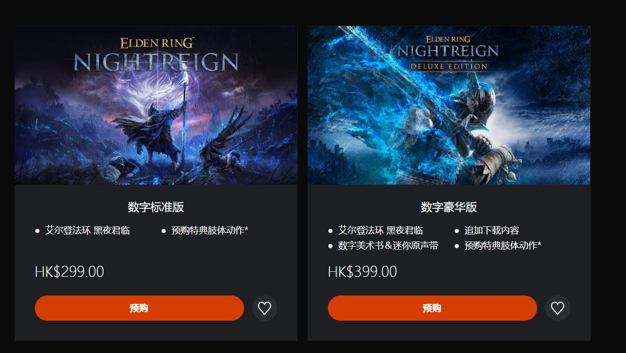 《艾尔登法环:黑夜君临》在PS HK商店中,标准版售价299HKD,豪华版399HKD。Steam国区标准版198元,豪华版268元。除数字版外,本作还提供实体的铁盒豪华版和限定版。后者额外赠送“追踪者”角色模型、精装美术书以及8张“渡夜者”特卡。