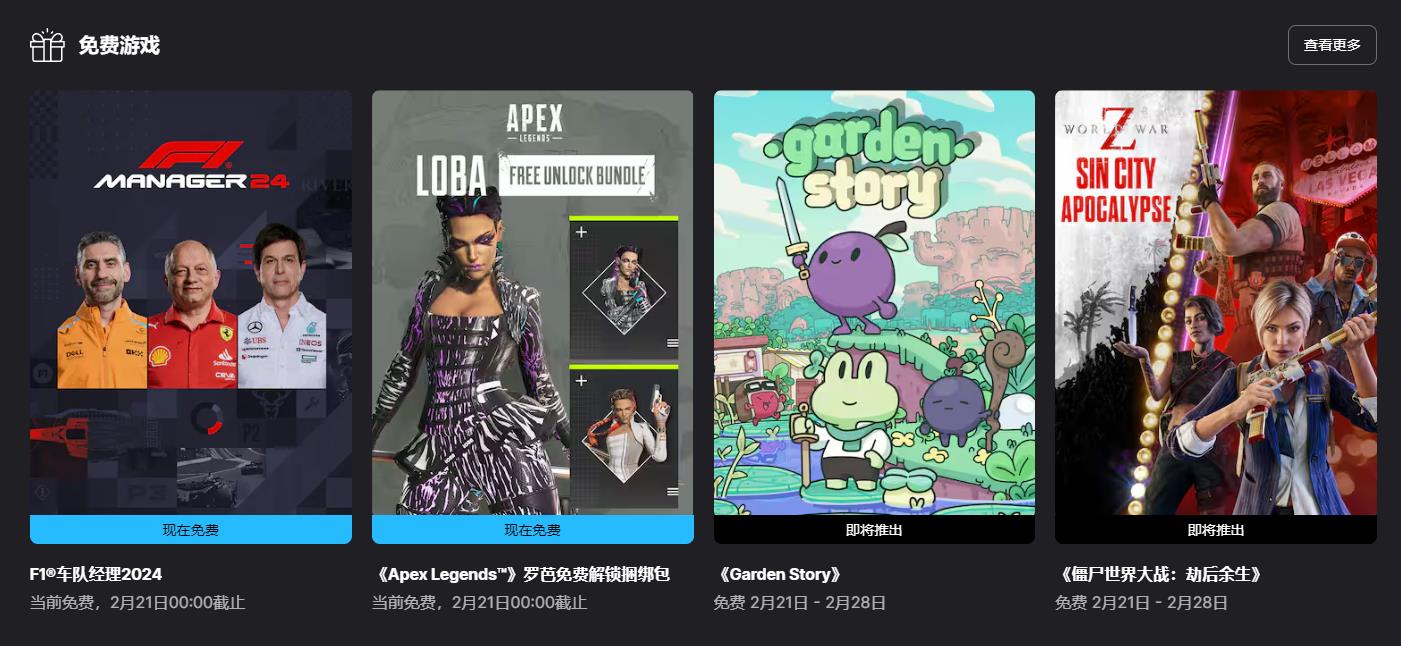 【Epic喜+2】模拟游戏《F1车队经理2024》和大逃杀英雄射击游戏《Apex Legends》DLC罗芭免费解锁捆绑包现已可在Epic商店中免费领取,领取后永久入库,截止时间为2月21日00:00。下周免费游戏为《花园故事(Garden Story)》和《僵尸世界大战:劫后余生》。