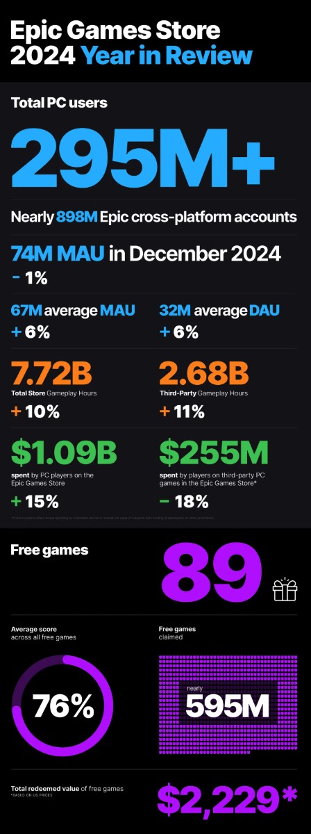 【Epic的PC玩家数量达到2.95亿】Epic Games Store发布年度回顾,宣布其PC玩家总数已达2.95亿,较2023年增长2500万。而使用Epic跨平台账户的玩家则来到了8.98亿人,相较于2023年增加了9400万人。同时,Epic的免费游戏赠送活动已持续五年,2024年共送出89款游戏,并确认该政策将在2025年继续。2024年,Epic的每日活跃用户增长6%,达到3150万,月活跃用户同样增长6%,达到6720万。