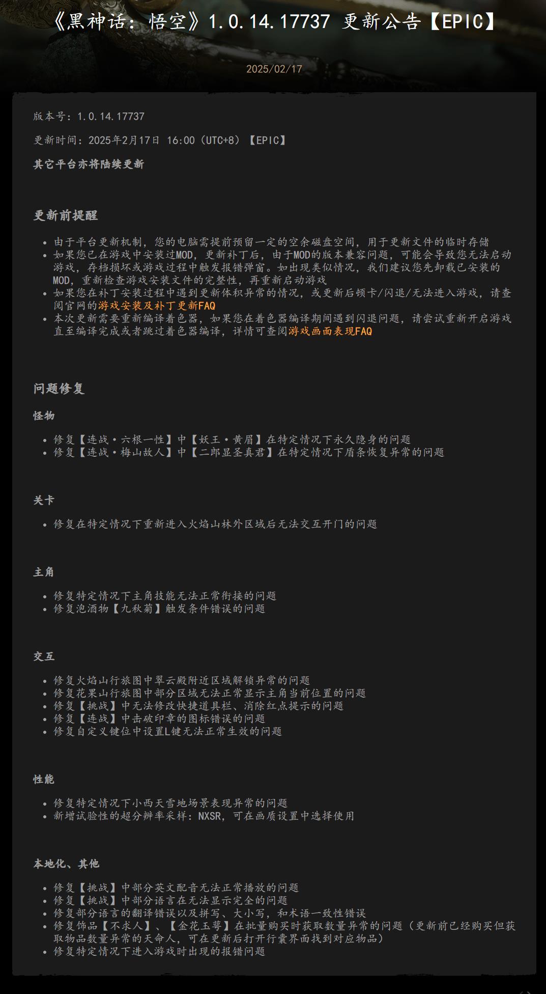 【《黑神话:悟空》版本更新:修复黄眉永久隐身等问题】游戏科学于昨晚在Epic上为《黑神话:悟空》推送了版本1.0.14.17737的更新(其它平台亦将陆续更新)。此次更新主要修复了“黄眉永久隐身”“二郎神盾条恢复异常”“火焰山林外区无法开门”“主角技能无法正常衔接”以及部分交互、本地化,以及如进游戏报错等其他已知问题。在性能方面上,修复了特定情况下小西天雪地场景表现异常的问题,并新增试验性的超分辨率采样NXSR(具体说明详见附图)。根据此前惯例,《黑神话:悟空》新版本将很快推送至PS5和Steam平台。