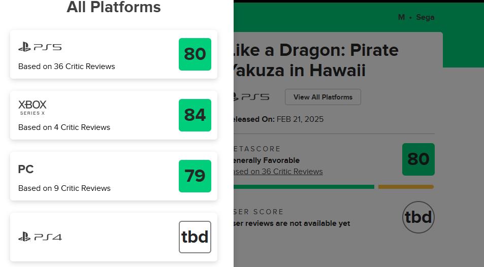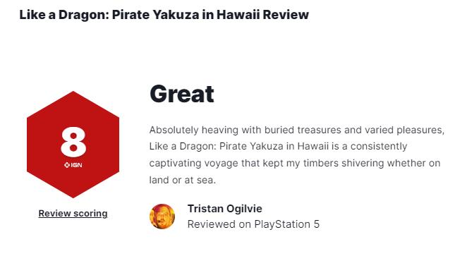 【《人中之龙8外传》评分解禁:MC均分80,获IGN8分,GS7分评价】由世嘉所带来的动作冒险游戏《人中之龙8外传:夏威夷海盗》全球媒体评测现已解禁。截至目前,游戏在MC上PS5版均分80(暂由36家媒体给出),PC版79分(暂由9家媒体给出),Xbox版84分(暂由4家媒体给出)。其中IGN为其打出了8分,GameSpot则给出了7分评价。