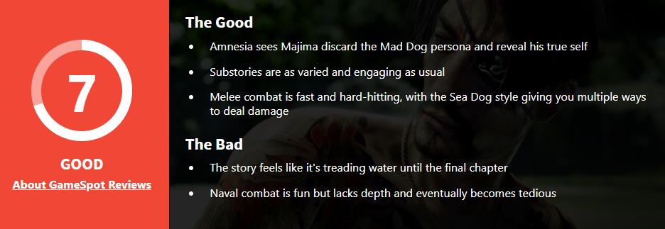 GameSpot:总的来说是一款不错衍生作品。人气角色真岛带来了一场充满欢乐和疯狂的海盗冒险。支线和以前一样丰富且吸引人,战斗也很爽快。不过剧情感觉很拖沓,直到最后一章才开始推进。海战虽有趣但缺乏深度,使其最后会变得有些单调乏味。