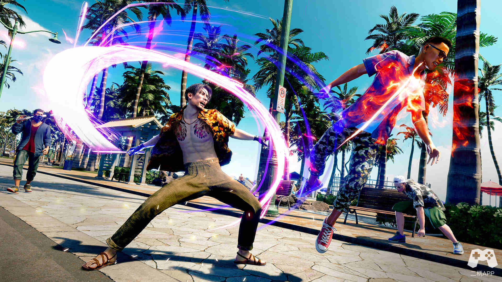 《人中之龙8外传:夏威夷海盗》的战斗系统是游戏的一大亮点。玩家可以在“狂犬”和“海盗”两种战斗风格之间自由切换。“狂犬”风格延续了Majima敏捷且极具攻击性的战斗特点,你可以使用快速的匕首连击和空中组合技来击败敌人。而“海盗”风格则为本作特制,完美展现了海盗主题。弯刀、手枪和钩索等武器一应俱全,让战斗变得眼花缭乱。此外,游戏还引入了“疯狂值”,当其充满时,玩家可以召唤出多个真岛吾朗的分身,不仅让你从我方视角感受到真岛吾朗的看家本领,也在面对大量敌人时更具优势。