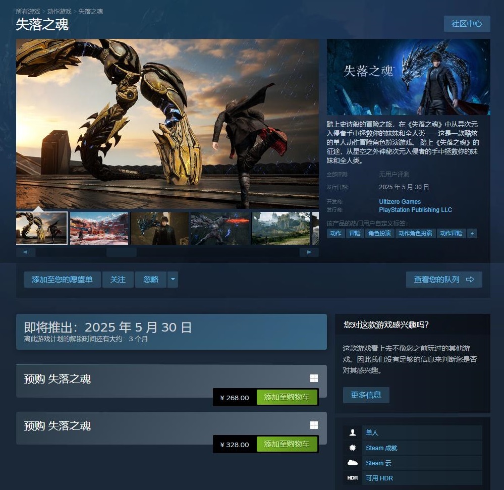 《失落之魂》Steam/Epic上普通版售价268元,PC配置要求揭晓