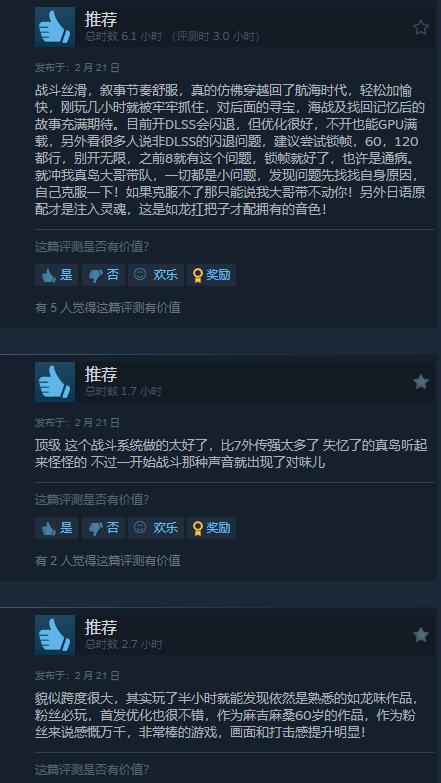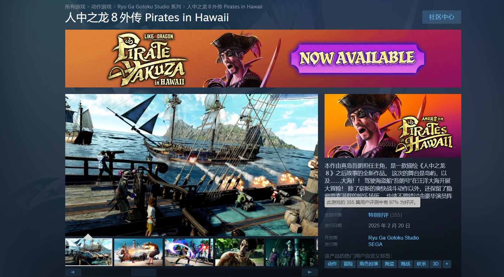 【《人中之龙8外传》Steam上“特别好评”,首日补丁追加中配和新游戏+】由真岛吾朗担任主角的《人中之龙8外传:夏威夷海盗》现已正式发售。截至目前,游戏在Steam上已有355篇评测,其中玩家好评率97%。国区63篇,好评率82%。不少玩家对游戏动作(非回合制)的战斗系统给予了好评,不过也有粉丝表示剧情上稍微有些问题。