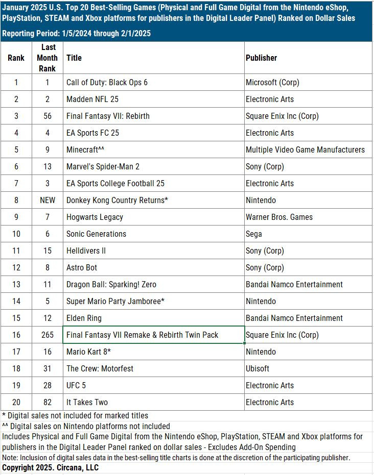 【受益于PC版本的发布,《最终幻想7:重生》销量上涨明显】据Circana分析师Mat Piscatella披露,《最终幻想7:重生》PC版于2025年1月发售首周即拉动该作在美国地区销量暴涨,游戏从12月的第56名跃升至1月全美畅销榜第三位,仅次于《使命召唤:黑色行动6》与《麦登橄榄球25》。双版本合集(含《重制版》与《重生》)销量亦从265名攀升至16名,实现强势反弹。