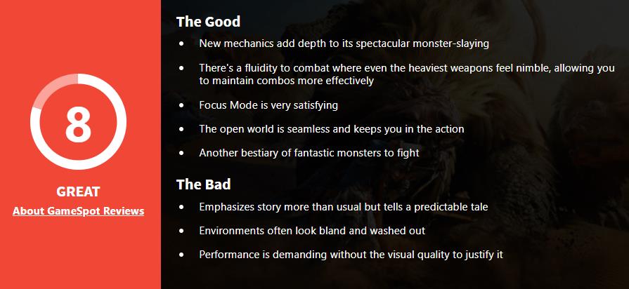GS(测试平台PC):虽说有一些问题,但本作通过优秀的狩猎体验,复制了《怪猎》的成功秘诀。《荒野》的新机制很有深度,战斗更加流畅。集中模式令人满意,无缝的开放世界也更具沉浸感。不过游戏环境质量不高,色彩暗淡。视觉体验一般,尤其实在某些天气下,与其相对较高的硬件要求不成正比。虽说此次稍微重视了一点剧情,但故事略显平庸。