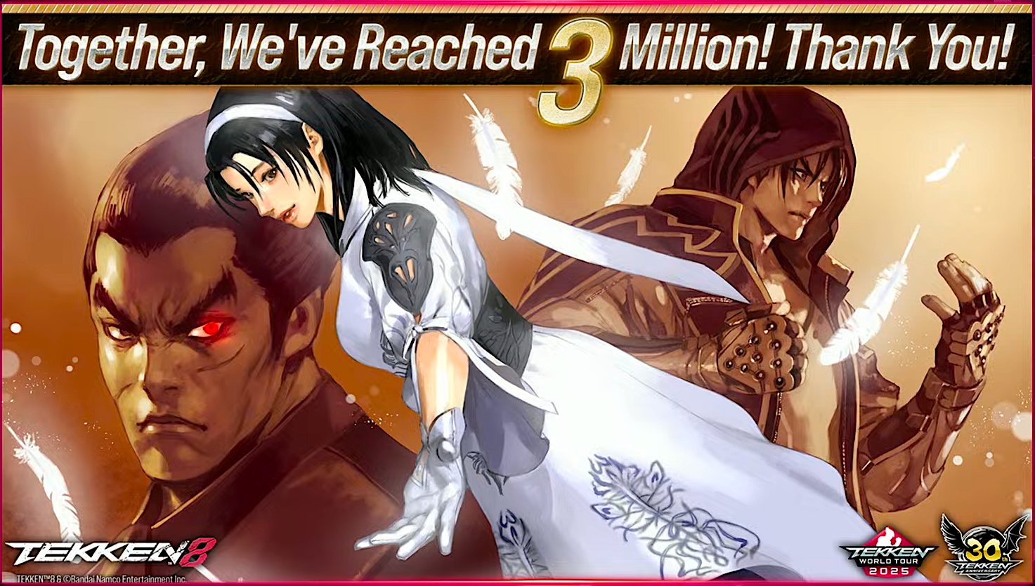 【《铁拳8》全球累计销量突破300万份】万代南梦宫在今日的“铁拳直播节目”中宣布,《铁拳8》全球累计销量现已突破300万份。3D格斗游戏《铁拳8》即将于明日迎来上市一周年,官方表示,本作实现这一里程碑的速度要比目前已售出1200多万份的《铁拳7》更快。《铁拳8》现已登录PS5、Xbox Series、Steam。
