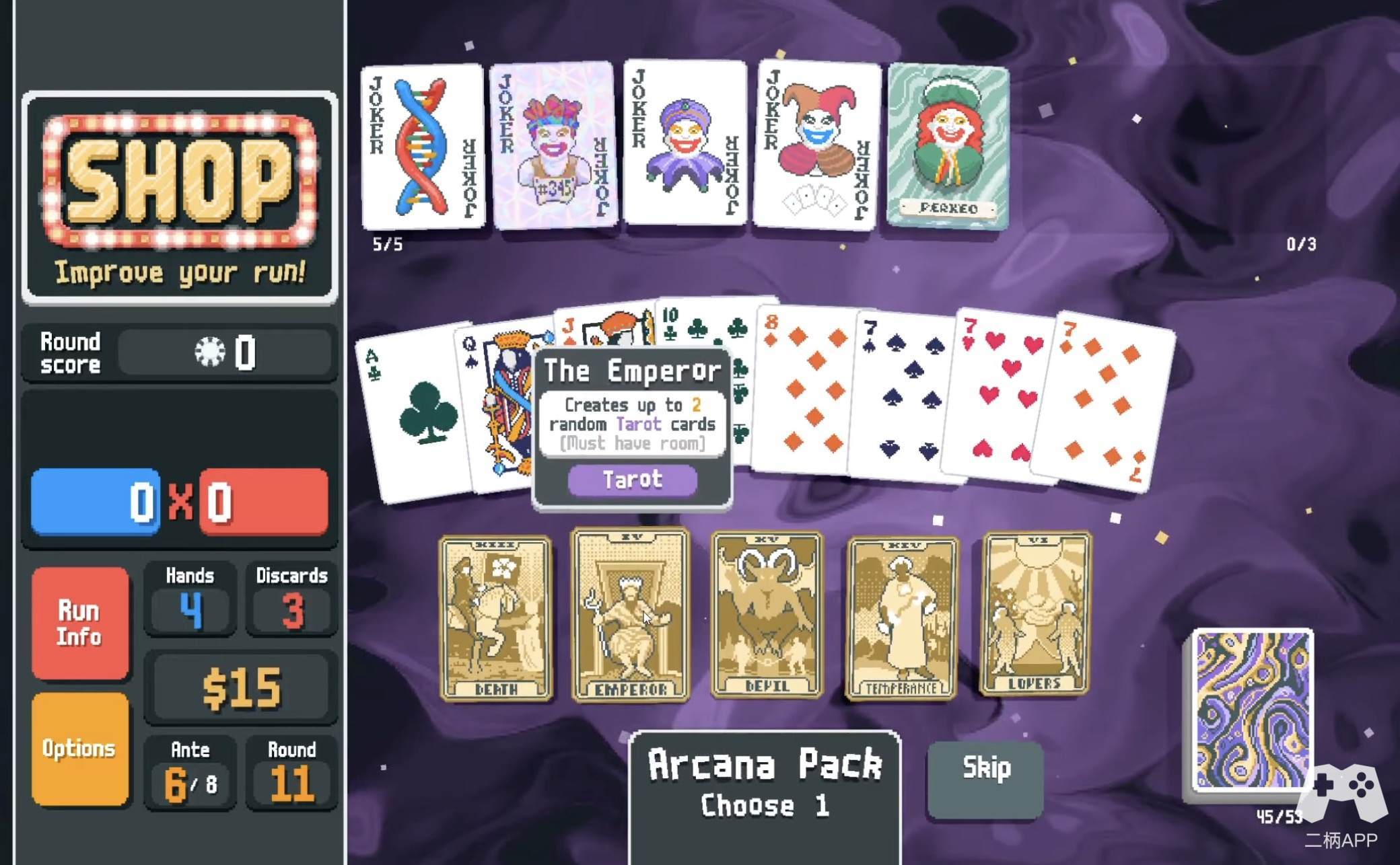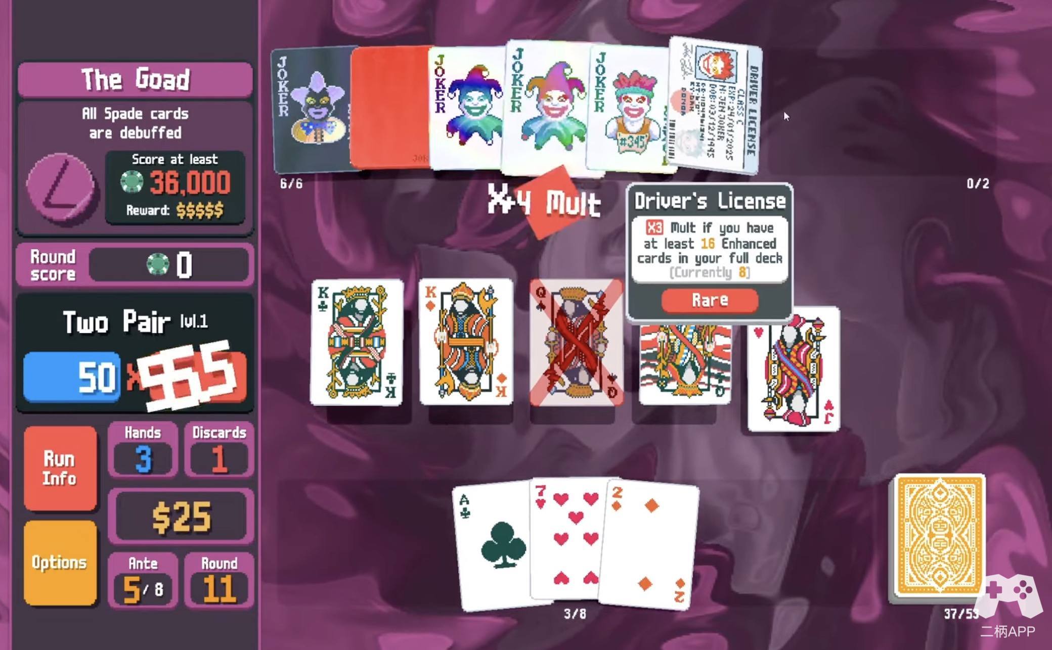 如果说《小丑牌》有什么独一无二的特色,那一定是它的“小丑牌”系统。这些小丑牌不仅是游戏的核心机制,也是其灵魂所在。每一张小丑牌都拥有独特的效果,比如“让所有红桃牌的分值翻倍”或“每打出三张牌就随机生成一张新牌”。这些效果看似疯狂,但却能在关键时刻扭转战局。