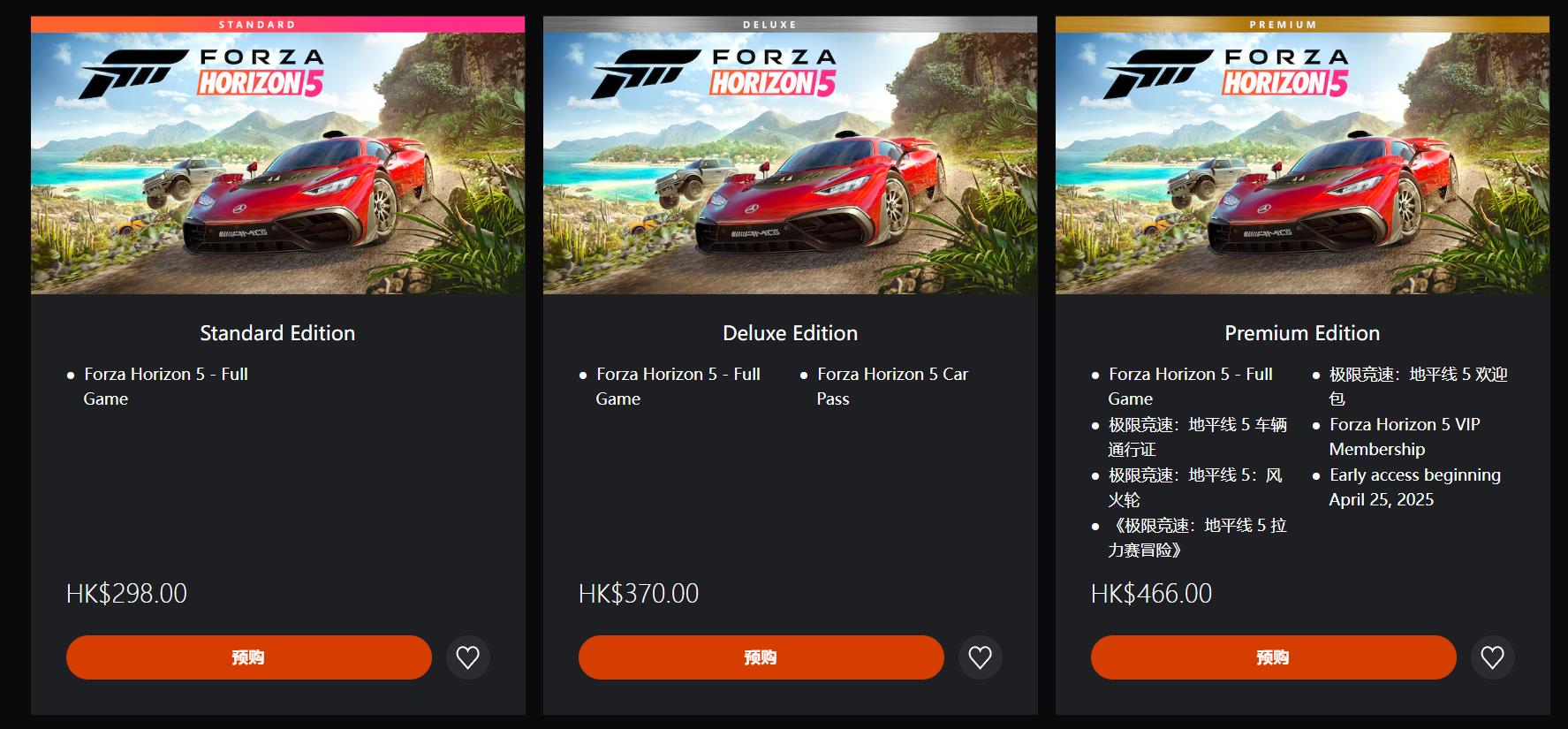 PS5版《极限竞速:地平线5》现已开放预约,标准版售价298HKD。豪华和顶级版分别售价370HKD和466HKD(后者可提前4天进入游戏)。
