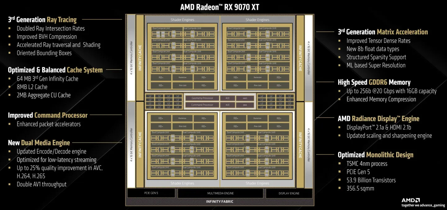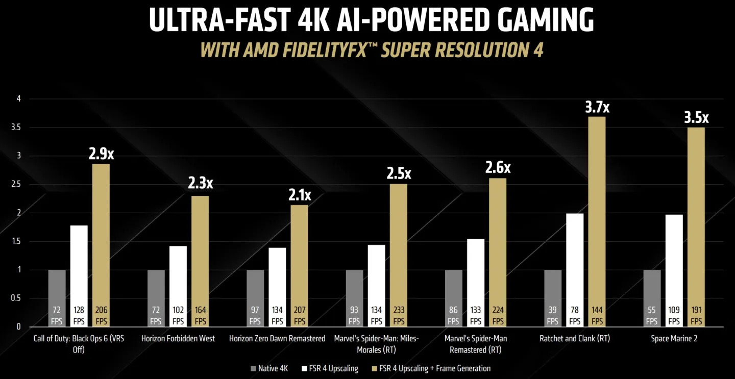 【AMD发布Radeon RX 9070系列显卡,定价4499元起】AMD宣布将于3月6日正式推出Radeon RX 9070及9070 XT显卡,定价分别为4499元和4999元。两款显卡均基于RDNA4架构,配备16GB GDDR6显存,支持PCIe 5.0及DisplayPort 2.1a接口,功耗220W。据AMD性能数据,9070 XT在4K分辨率下较四年前的RX 6900 XT提升51%,较RTX 3090快26%,并搭载全新FSR 4超分辨率技术,在《战锤40K:星际战士2》中开启后帧率从53fps提升至182fps。