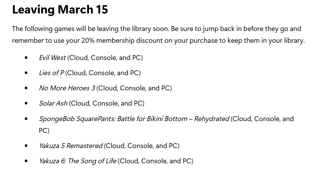 3月15日:《暗邪西部》 (云端/主机/PC),《匹诺曹的谎言》 (云端/主机/PC),《英雄不再3》 (云端/主机/PC),《太阳灰国》 (云端/主机/PC),《海绵宝宝:比基尼海滩之战 补充水分》 (云端/主机/PC),《人中之龙5 复刻版》 (云端/主机/PC)《Yakuza 6:The Song of Life》 (云端/主机/PC)