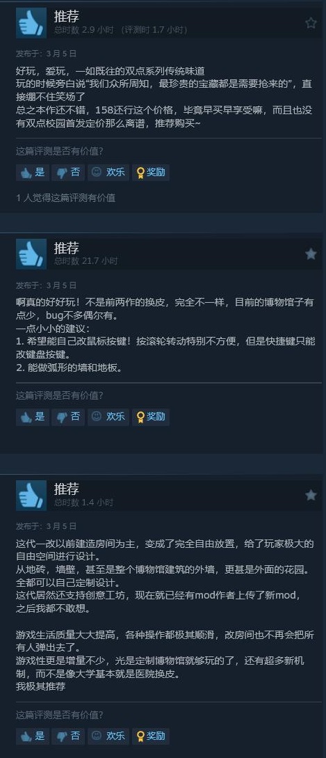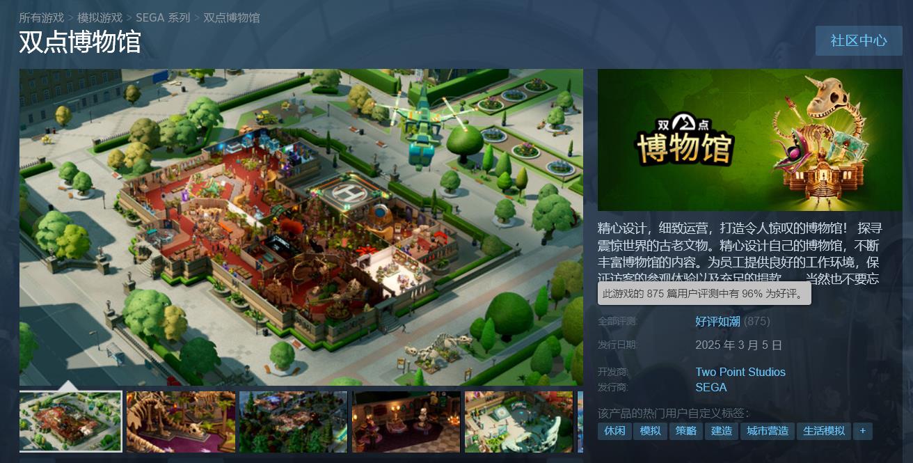 【《双点博物馆》Steam上获玩家“好评如潮”】由双点工作室所带来的模拟经营新作《双点博物馆》已于今日发售。游戏目前在Steam上已有875篇评测,其中玩家好评率96%,整体为“好评如潮”。国区评测252篇,好评率91%。大部分玩家对本作的质量都给予了认可,称其在前作(医院/校园)的基础上,进一步丰富了游戏的内容。虽然存在一些BUG,但好玩且上头的属性使其非常值得推荐。此外,随着游戏的上市,官方今日还公布了本作的媒体赞誉图。《双点博物馆》Steam标准版售价158元,游戏支持中文界面、完全音频以及字幕。