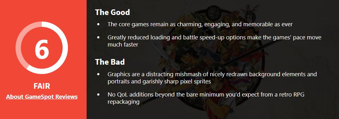 GameSpot(6分):情怀依旧,诚意不足!内容经典,并优化了战斗加载时间和可调的战斗速度。虽然背景/立绘进行了高清化处理,但角色像素却未变,这让画面观感很是违和。其他附加内容也很少,完全没有发挥出这款经典之作的潜力。