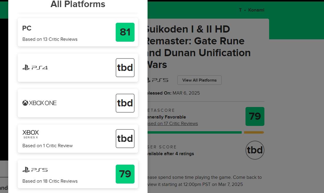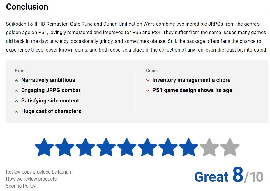 《幻想水浒传1&2:HD复刻版》MC均分79,获GS 6分评价