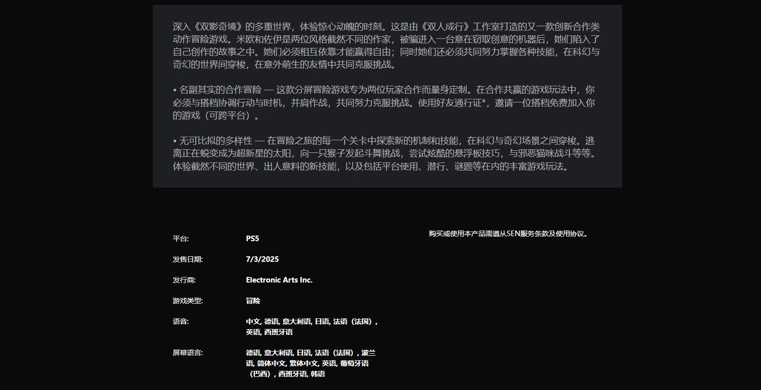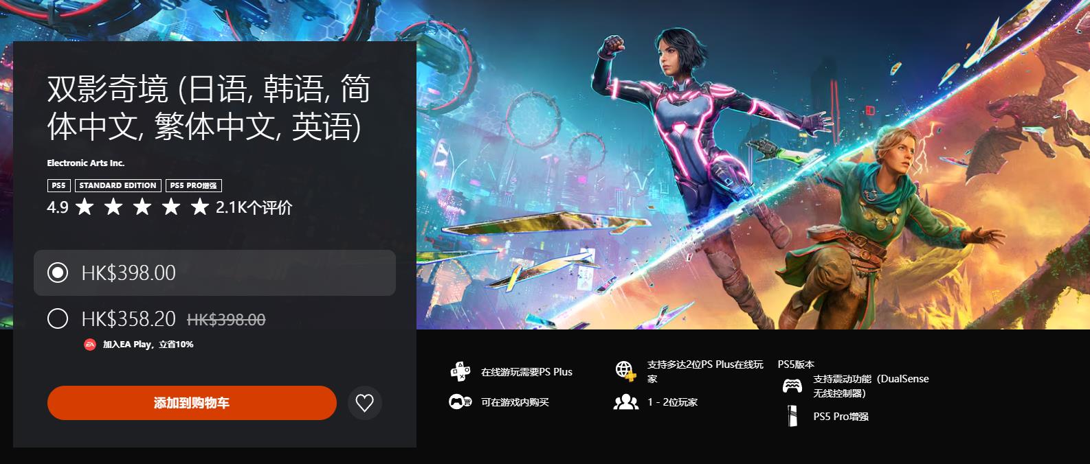 【《双影奇境》PS商店上全球玩家评分4.9】《双影奇境》已于今日正式上市,游戏除在Steam拥有97%的玩家好评率外,在PS商店中也取得了不错的反馈。截至目前,本作在该平台上已有2166个评价,总分4.9。其中五星好评率96%,1%的用户打出四星,2%的人给出一星。《双影奇境》支持PS5 Pro增强,在线游玩需要订阅PS Plus服务,游戏支持跨平台和好友通行证。
