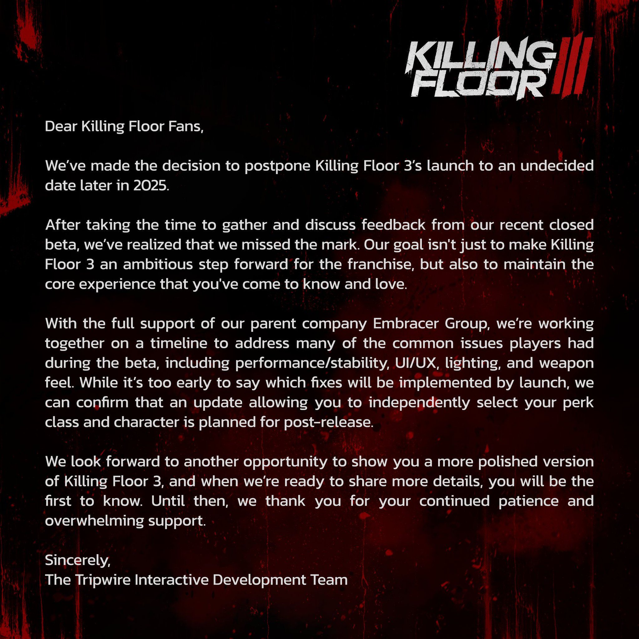 在公开信中,开发团队表示游戏延期是因为通过封闭测试收集玩家反馈后,认为游戏当前版本未达到预期目标,需更多时间优化。他们的核心目标是在保留系列经典体验的基础上,实现 “更具野心”的突破。接下来会优先修复优先修复性能与稳定性,UI/UX,光照效果,武器操作手感等问题,并计划通过首日补丁,允许玩家独立选择职业和角色。
