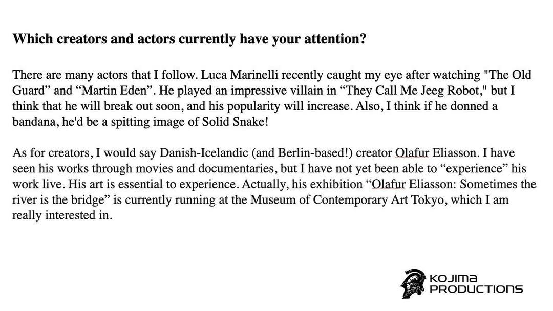 “我关注的演员很多。不过我最近在观看《永生守卫》后对卢卡很感兴趣。他在《他们叫我吉克》所饰演的反派给我留下了十分深刻的印象。此外,我感觉他若是戴上头巾的话,应该会与‘固蛇(Solid Snake)’非常相似!”