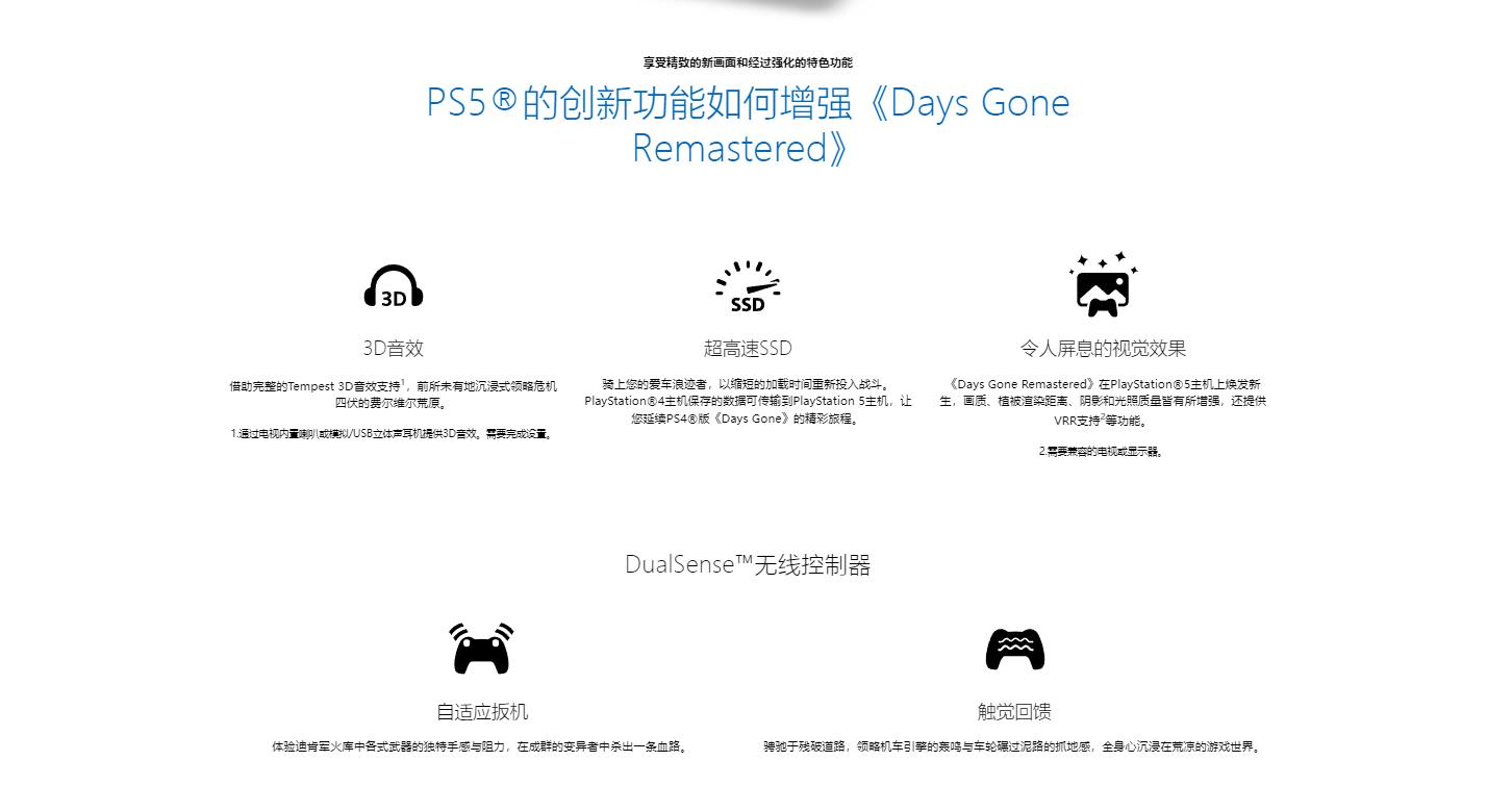 6、适配PS5,包括超高速SSD、3D音效、自适应扳机、触觉回馈以及更强劲的视觉效果。